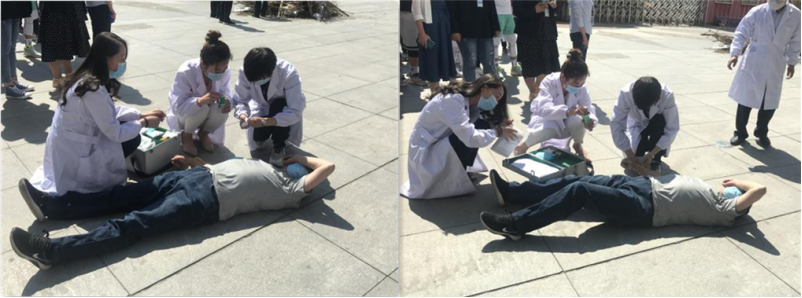 在模擬火災(zāi)救援現(xiàn)場中發(fā)現(xiàn)被困人員,由應(yīng)急救援隊(duì)將被困人員從火場中救出并帶至安全區(qū),由醫(yī)療救護(hù)組對傷員進(jìn)行救治及轉(zhuǎn)移。
