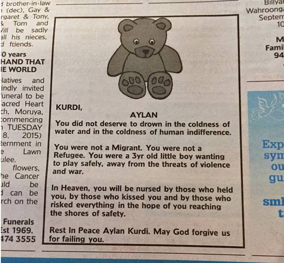 在澳大利亞,還有人在9月4日的《悉尼先驅晨報》上為小Aylan發(fā)了份訃告。