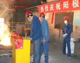 2012年7月7日上午11點(diǎn)零19分,青海物產(chǎn)工業(yè)投資有限公司10萬(wàn)噸電解鋁/年升級(jí)改造項(xiàng)目,簡(jiǎn)易陽(yáng)極組裝車間大門前鞭炮齊鳴。青海物產(chǎn)工業(yè)投資有限公司黨總支副書(shū)記、青海長(zhǎng)春炭素有限公司總經(jīng)理王松華,公司常務(wù)副總經(jīng)理、項(xiàng)目副總指揮常海寧,工業(yè)投資和長(zhǎng)春炭素公司副總經(jīng)理姜紅萍,公司副總經(jīng)理張秉瑜,總經(jīng)理助理范登福等公司領(lǐng)導(dǎo)和各車間、部室的職工出席了簡(jiǎn)單的點(diǎn)火澆鑄儀式。王松華同志按下了點(diǎn)火按鈕鄭重宣布澆鑄正式開(kāi)始。當(dāng)中頻爐工將第一爐鐵水倒入抬包時(shí),標(biāo)志著新陽(yáng)極組裝車間正式投產(chǎn)運(yùn)行。