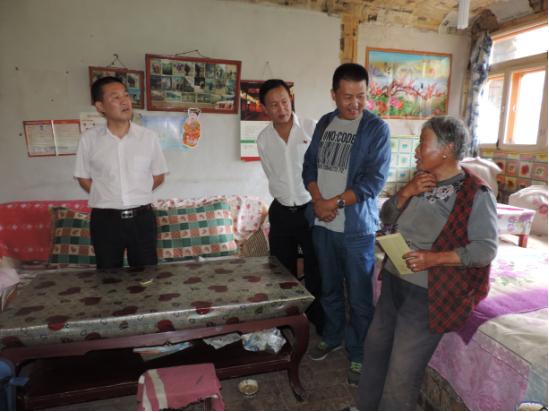 朝物開投公司副總經(jīng)理喇軍民、物產(chǎn)汽貿(mào)公司董事長張建軍、機(jī)電市場公司市場部部長王功明以"三幫一"的方式結(jié)對幫扶絕對困難戶楊生福。楊生福,男,藏族,61歲,家中三口人,本人肢體四級殘疾,妻子四級殘疾(羅鍋),兒子30歲,現(xiàn)安排在當(dāng)?shù)貜氖伦o(hù)林員工作,未結(jié)婚,住房為土木結(jié)構(gòu),此次結(jié)對幫扶為其送去了600元慰問金。