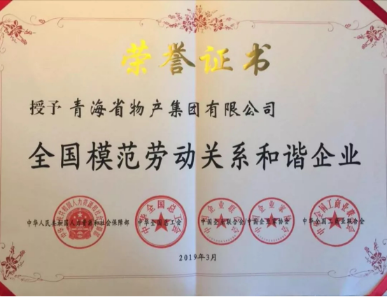 由青海省人力資源和社會保障廳、青海省總工會、青海省企業(yè)聯(lián)合會/企業(yè)家協(xié)會、青海省工商業(yè)聯(lián)合會共同推薦申報,青海省物產(chǎn)集團有限公司、青?;ブ囡乒煞萦邢薰?、正平路橋建設(shè)股份有限公司榮獲全國模范勞動關(guān)系和諧企業(yè)光榮稱號,西寧經(jīng)濟技術(shù)開發(fā)區(qū)東川工業(yè)園區(qū)榮獲全國模范勞動關(guān)系和諧工業(yè)園區(qū)光榮稱號,受到了國家人力資源和社會保障部、中華全國總工會、中國企聯(lián)、全國工商聯(lián)的隆重表彰。