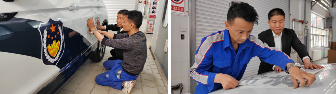 圖5為:售后漆工冶龍正在為警車貼警徽標(biāo)志,他說:“警車是公務(wù)用車,每次粘警飾我都感到很神圣,干活兒特別用心細(xì)致,一定要把車身警飾做得非常好才行。警徽閃耀,守望千家萬戶。我是漆工也是工匠,必須精益求精,把活兒干漂亮,這也是汽貿(mào)漆工的臉面。每次我都把車清洗干凈,用卷尺量好間距,用記號(hào)筆畫好。在貼的過程中用刮板反復(fù)擠壓空氣,這樣才能使警徽粘得更牢固更美觀。我要把公司倡導(dǎo)的勞動(dòng)精神、工匠精神,通過不斷地學(xué)習(xí)鍛煉,提高本領(lǐng),把精湛的工匠手藝和貼心的服務(wù)傳遞給社會(huì)。