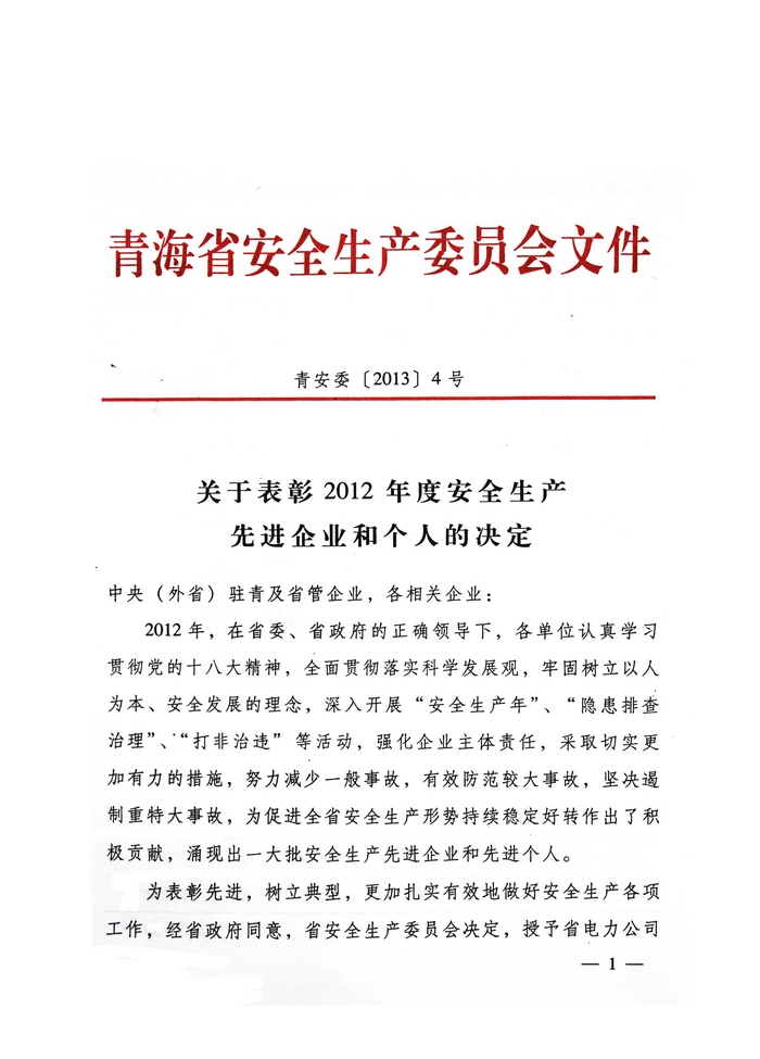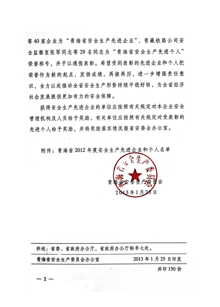 2012年,在省委、省政府的正確領(lǐng)導(dǎo)下,青海省物產(chǎn)集團(tuán)總公司認(rèn)真學(xué)習(xí)貫徹黨的十八大精神,全面貫徹落實(shí)科學(xué)發(fā)展觀,牢固樹(shù)立以人為本、安全發(fā)展的理念,深入開(kāi)展"安全生產(chǎn)年"、"隱患排查治理"、"打非治違"等活動(dòng),為促進(jìn)全省安全生產(chǎn)形勢(shì)持續(xù)穩(wěn)定好轉(zhuǎn)做出了積極貢獻(xiàn)。為此,經(jīng)省政府同意,省安全生產(chǎn)委員會(huì)決定授予青海省物產(chǎn)集團(tuán)總公司"2012年度安全生產(chǎn)先進(jìn)企業(yè)"榮譽(yù)稱號(hào)。